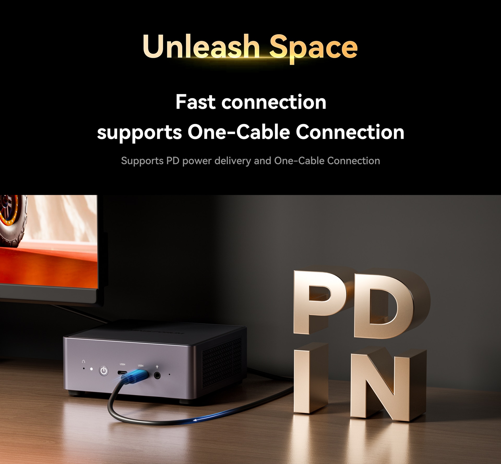 ตัวเครื่องออกแบบทันสมัยด้วยวัสดุโลหะ มาพร้อมช่องระบายอากาศด้านข้าง รองรับหน่วยความจำ DDR5 แบบ Dual Channel ความเร็วสูงสุด 5600MHz และสามารถเชื่อมต่อได้สูงสุด 4 หน้าจอพร้อมกัน รวมถึงรองรับการถอดรหัส AV1 จาก RDNA 3 GPU ใหม่บน Phoenix APU