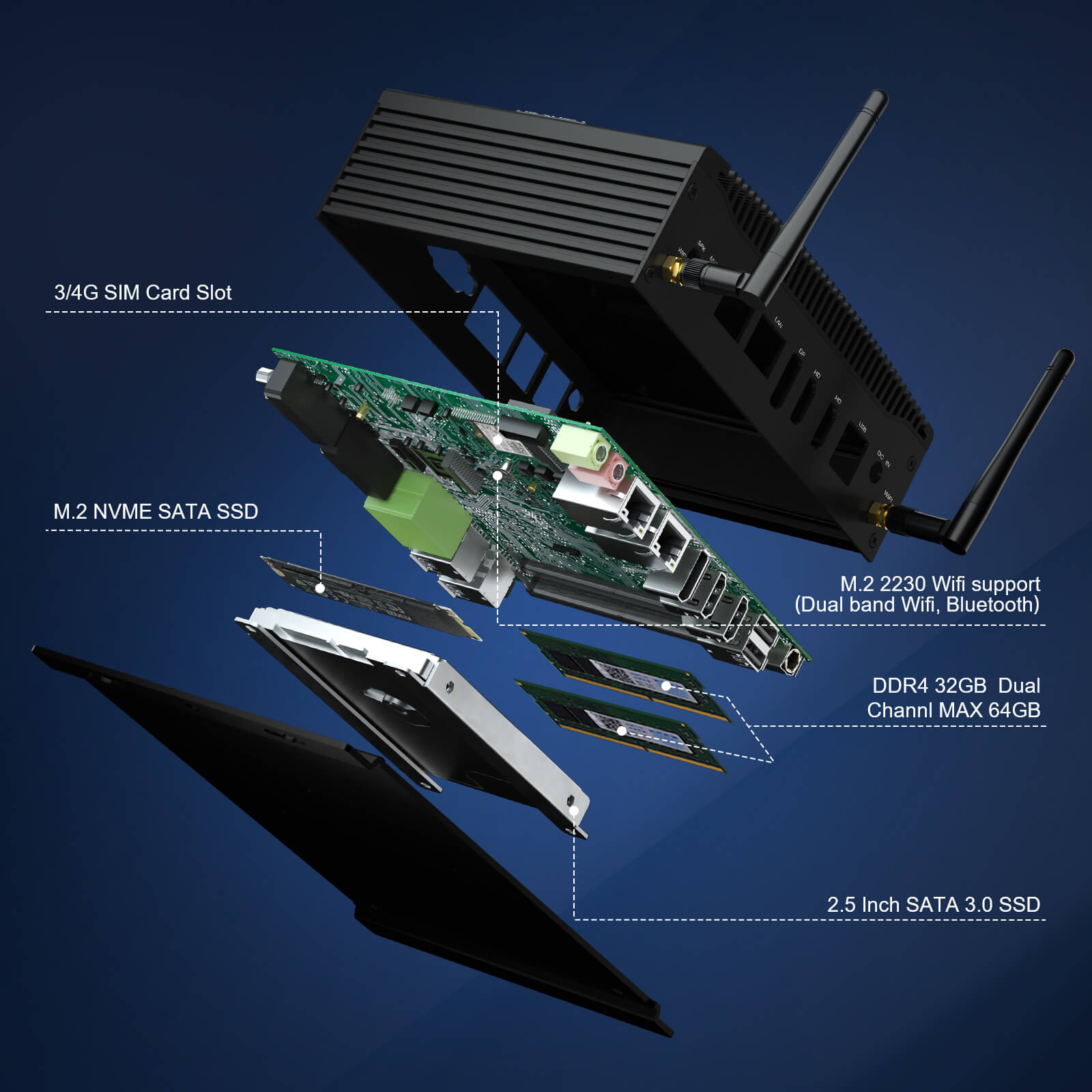 รองรับ Dual DDR4 (สูงสุด 64GB), M.2 NVMe/SATA SSD (สูงสุด 2TB) และช่อง SATA 2.5 นิ้ว เพิ่มการเก็บข้อมูลได้มากขึ้น รองรับ Nano-SIM สำหรับโมดูล 4G (ไม่รวมในชุด)