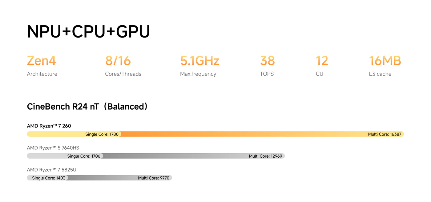Processor: AMD Ryzen™ 7 260, 8 cores, 16 threads, max 5.1GHz, Up to 38 TOPS