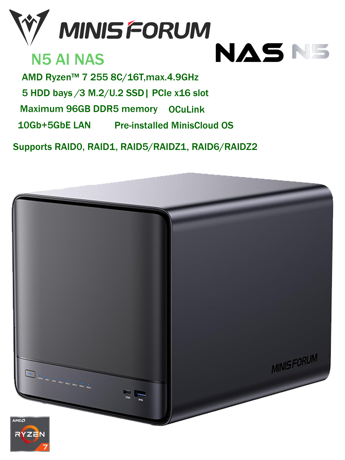 NAS Host Mini PC Minisforum N5 AI with AMD Ryzen™ 7 255 Supports RAID Your All-in-One Smart Platform